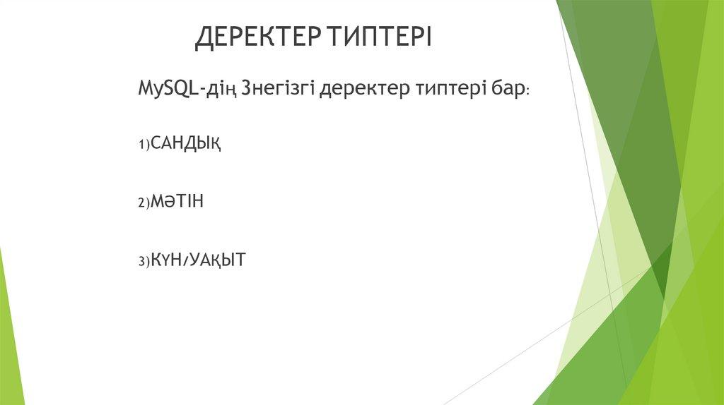 ДЕРЕКТЕР ТИПТЕРІMySQL-дің 3негізгі деректер типтері бар:
