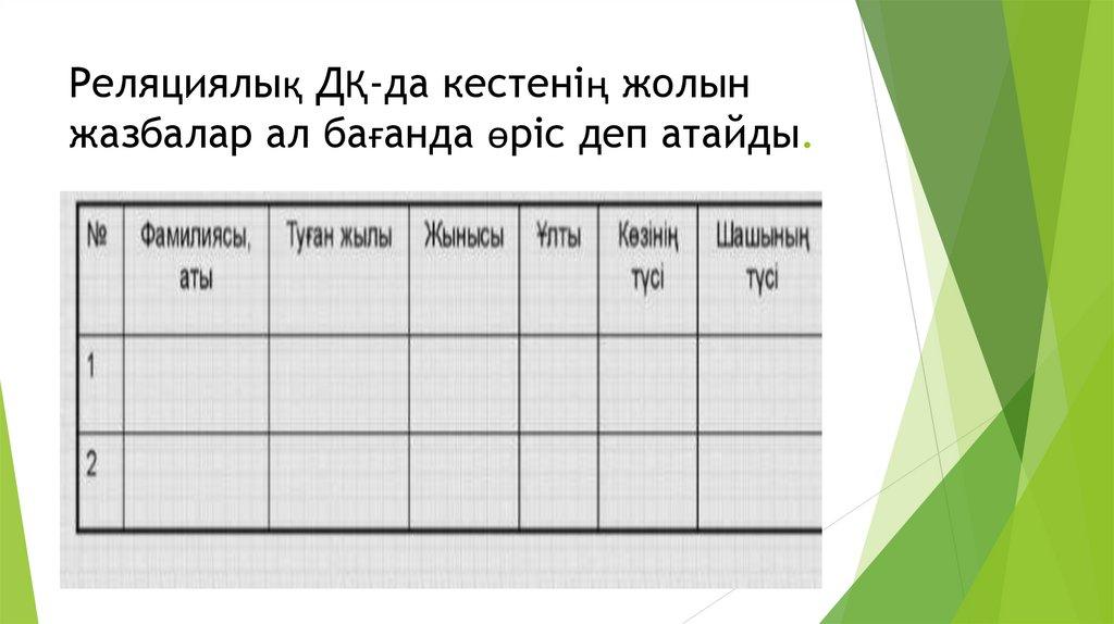 Реляциялық ДҚ-да кестенің жолынжазбалар ал бағанда өріс деп атайды.