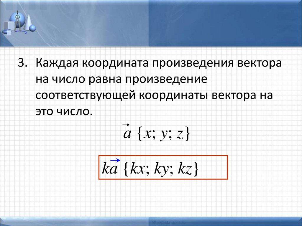 3. Каждая координата произведения векторана число равна произведение