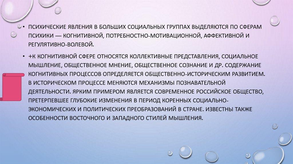 • ПСИХИЧЕСКИЕ ЯВЛЕНИЯ В БОЛЬШИХ СОЦИАЛЬНЫХ ГРУППАХ ВЫДЕЛЯЮТСЯ ПО СФЕРАМПСИХИКИ — КОГНИТИВНОЙ, ПОТРЕБНОСТНО-МОТИВАЦИОННОЙ, АФФЕКТИВНОЙ И