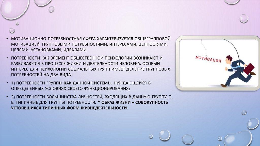 • МОТИВАЦИОННО-ПОТРЕБНОСТНАЯ СФЕРА ХАРАКТЕРИЗУЕТСЯ ОБЩЕГРУППОВОЙМОТИВАЦИЕЙ, ГРУППОВЫМИ ПОТРЕБНОСТЯМИ, ИНТЕРЕСАМИ, ЦЕННОСТЯМИ,