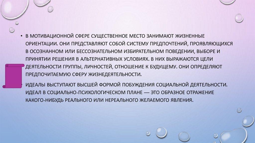 • В МОТИВАЦИОННОЙ СФЕРЕ СУЩЕСТВЕННОЕ МЕСТО ЗАНИМАЮТ ЖИЗНЕННЫЕОРИЕНТАЦИИ. ОНИ ПРЕДСТАВЛЯЮТ СОБОЙ СИСТЕМУ ПРЕДПОЧТЕНИЙ, ПРОЯВЛЯЮЩИХСЯ