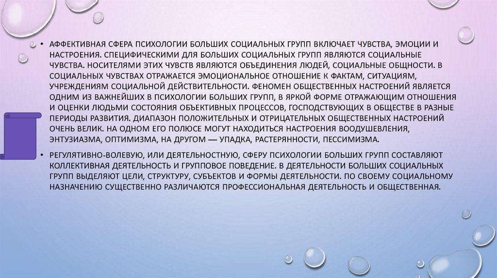 • АФФЕКТИВНАЯ СФЕРА ПСИХОЛОГИИ БОЛЬШИХ СОЦИАЛЬНЫХ ГРУПП ВКЛЮЧАЕТ ЧУВСТВА, ЭМОЦИИ ИНАСТРОЕНИЯ. СПЕЦИФИЧЕСКИМИ ДЛЯ БОЛЬШИХ СОЦИАЛЬНЫХ ГРУПП ЯВЛЯЮТСЯ СОЦИАЛЬНЫЕ