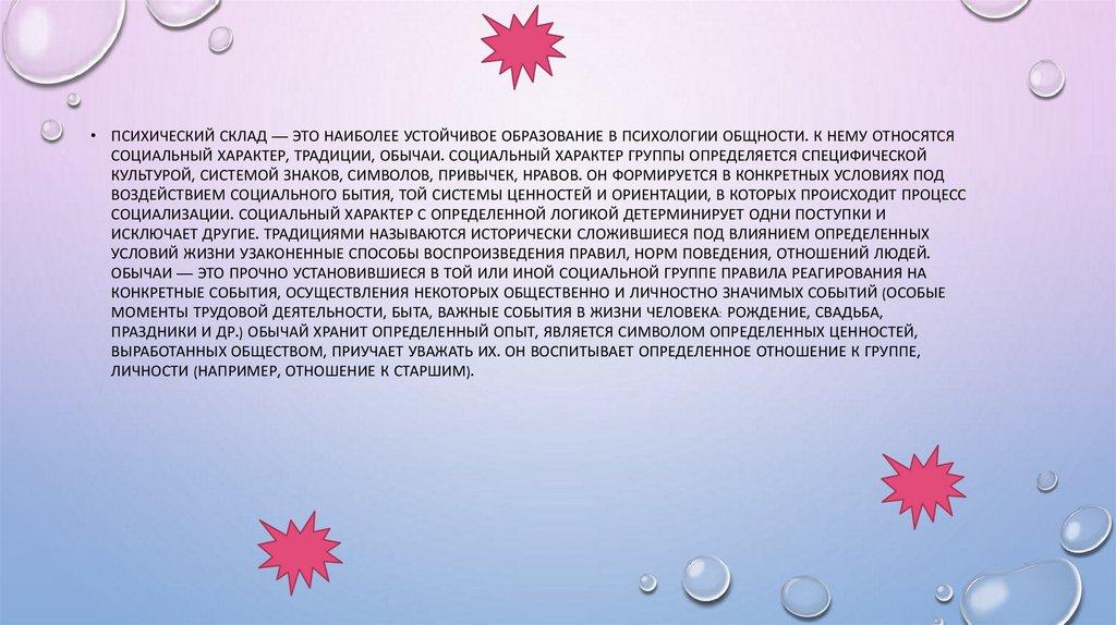 • ПСИХИЧЕСКИЙ СКЛАД — ЭТО НАИБОЛЕЕ УСТОЙЧИВОЕ ОБРАЗОВАНИЕ В ПСИХОЛОГИИ ОБЩНОСТИ. К НЕМУ ОТНОСЯТСЯСОЦИАЛЬНЫЙ ХАРАКТЕР, ТРАДИЦИИ, ОБЫЧАИ. СОЦИАЛЬНЫЙ ХАРАКТЕР ГРУППЫ ОПРЕДЕЛЯЕТСЯ СПЕЦИФИЧЕСКОЙ