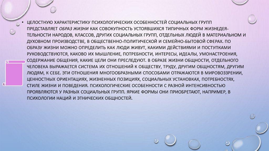 • ЦЕЛОСТНУЮ ХАРАКТЕРИСТИКУ ПСИХОЛОГИЧЕСКИХ ОСОБЕННОСТЕЙ СОЦИАЛЬНЫХ ГРУПППРЕДСТАВЛЯЕТ ОБРАЗ ЖИЗНИ КАК СОВОКУПНОСТЬ УСТОЯВШИХСЯ ТИПИЧНЫХ ФОРМ ЖИЗНЕДЕЯТЕЛЬНОСТИ НАРОДОВ, КЛАССОВ, ДРУГИХ СОЦИАЛЬНЫХ ГРУПП, ОТДЕЛЬНЫХ ЛЮДЕЙ В МАТЕРИАЛЬНОМ И