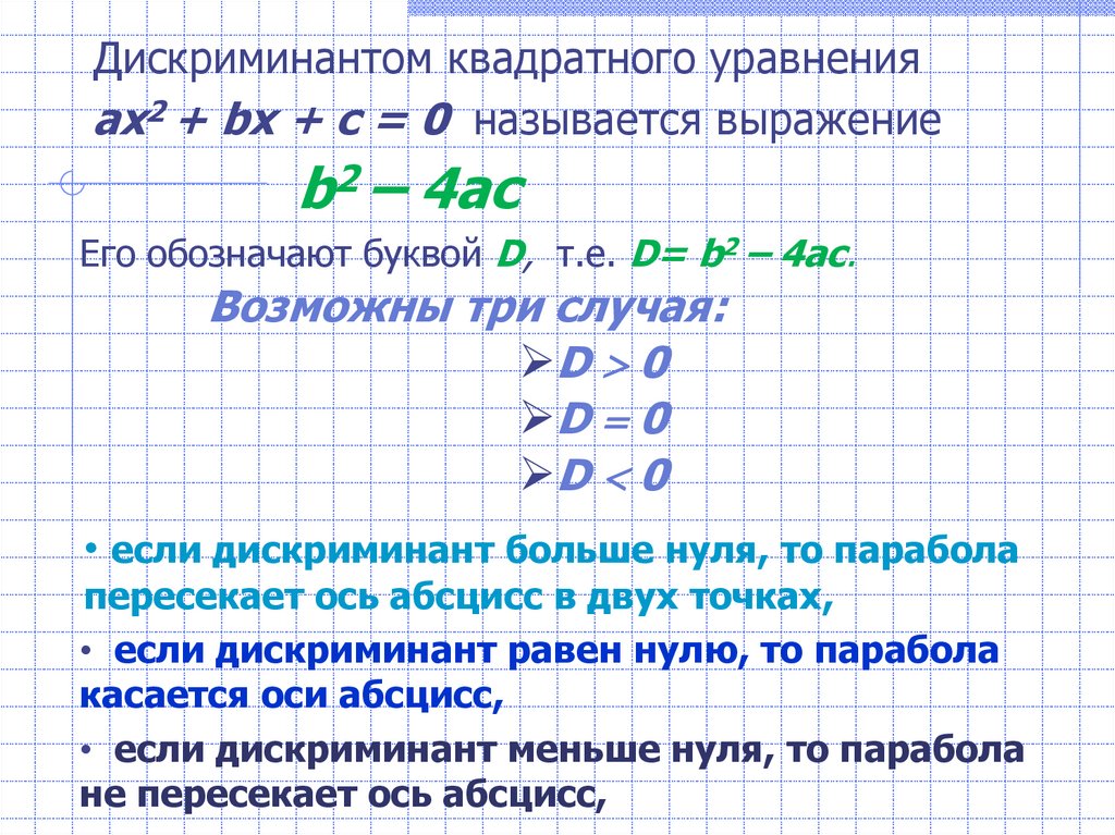 Его обозначают буквой D, т.е. D= b2 – 4ac.