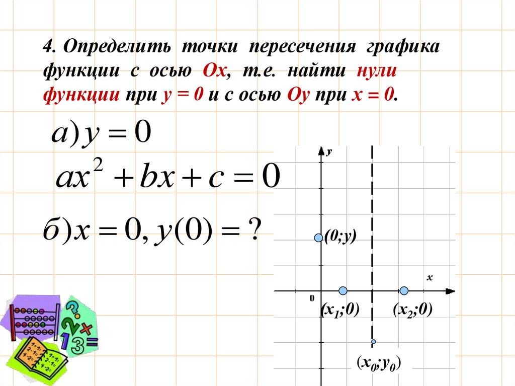 4. Определить точки пересечения графикафункции с осью Ох, т.е. найти нули