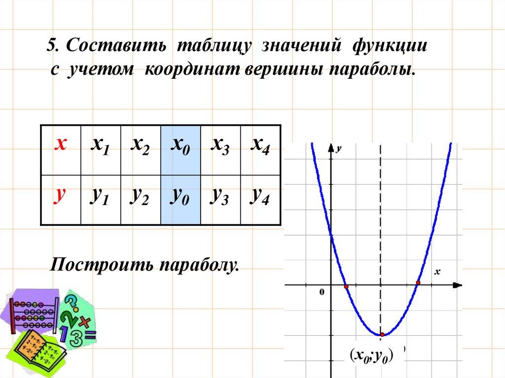 5. Составить таблицу значений функциис учетом координат вершины параболы.