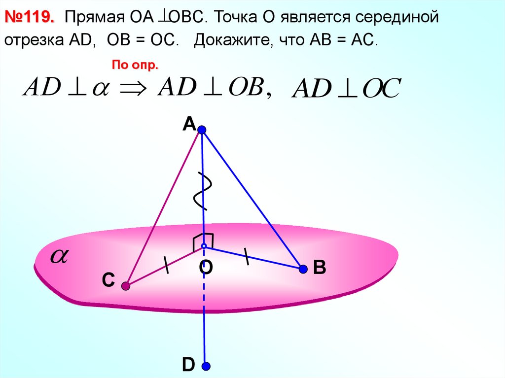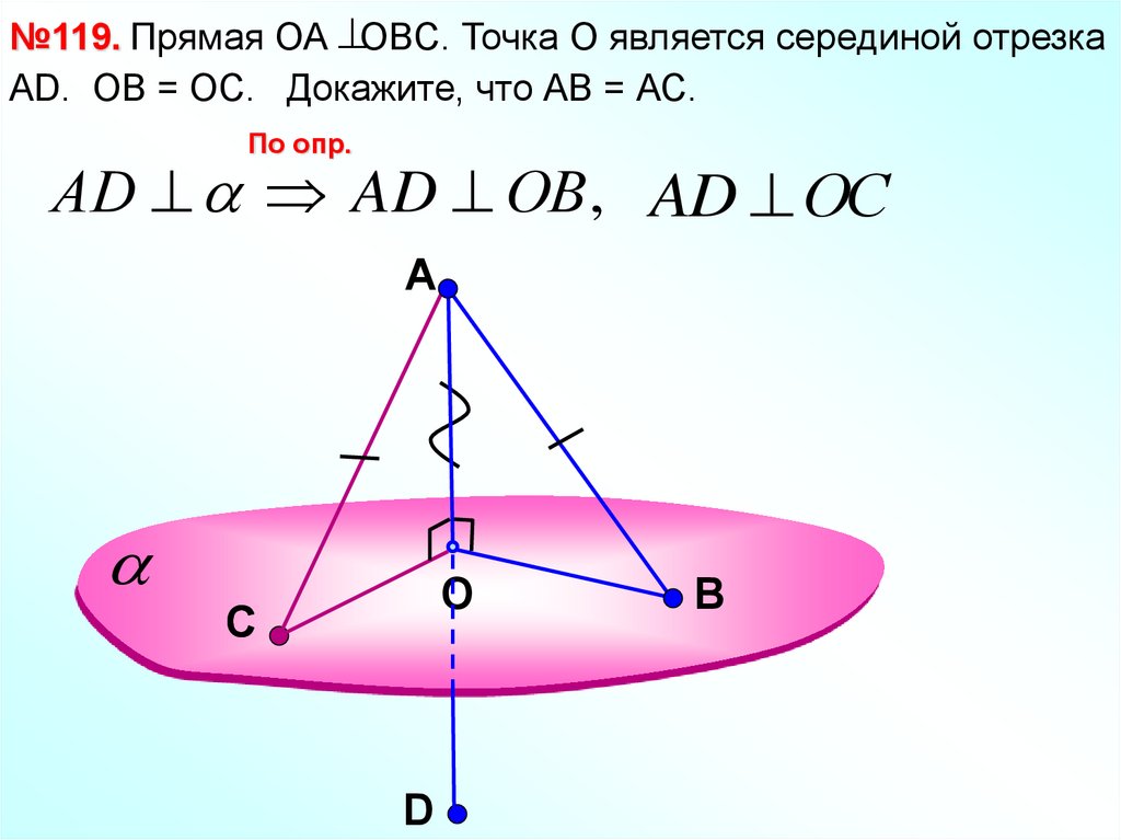 №119. Прямая ОА OBC. Точка О является серединой отрезкаАD. ОВ = ОС. Докажите, что АВ = АС.