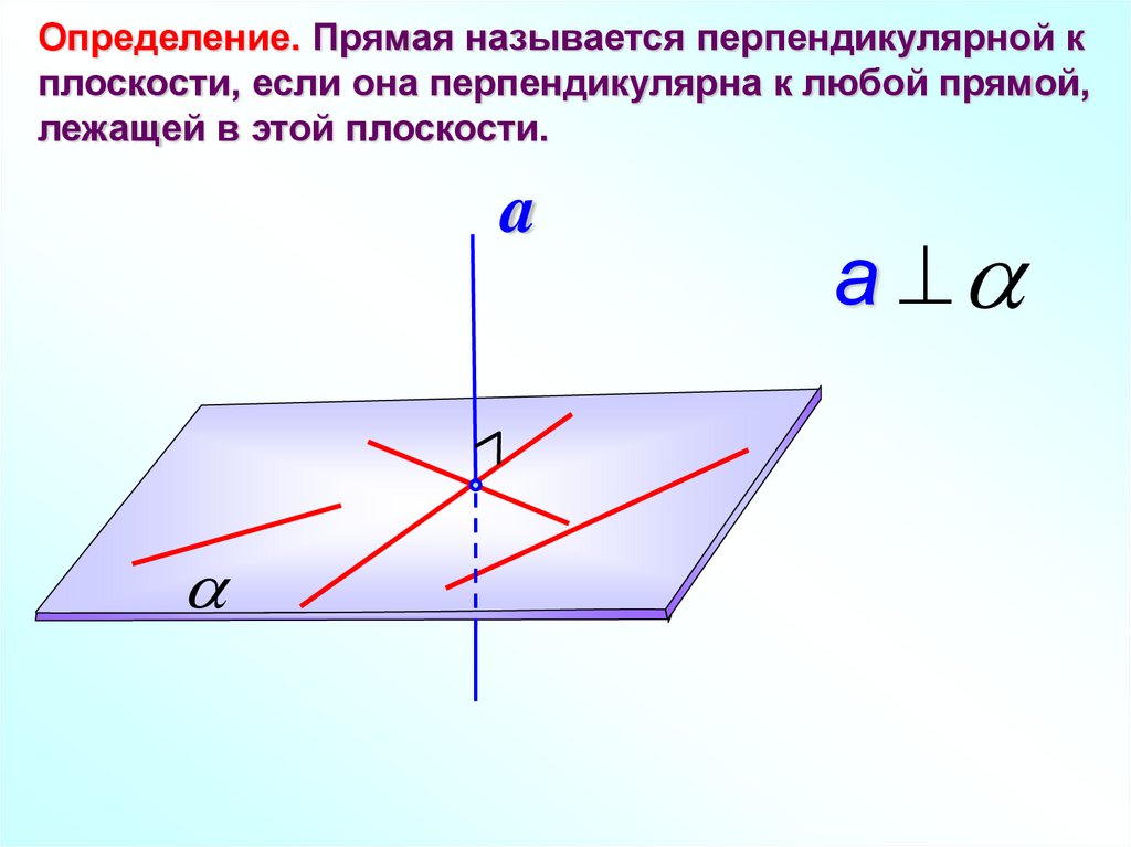 Определение. Прямая называется перпендикулярной кплоскости, если она перпендикулярна к любой прямой,