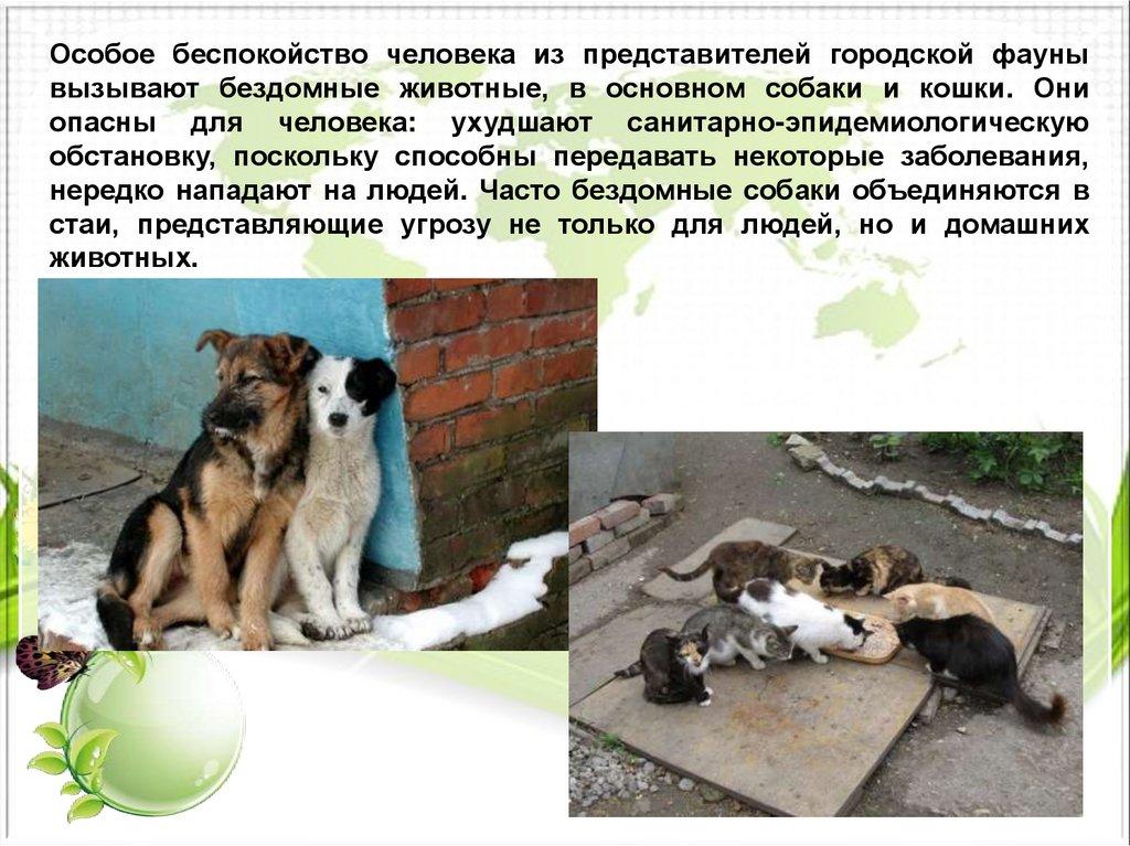 Особое беспокойство человека из представителей городской фаунывызывают бездомные животные, в основном собаки и кошки. Они