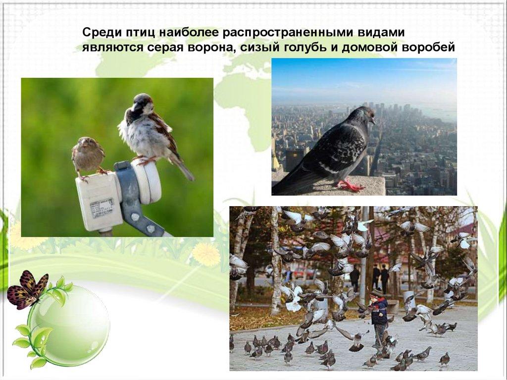 Среди птиц наиболее распространенными видамиявляются серая ворона, сизый голубь и домовой воробей