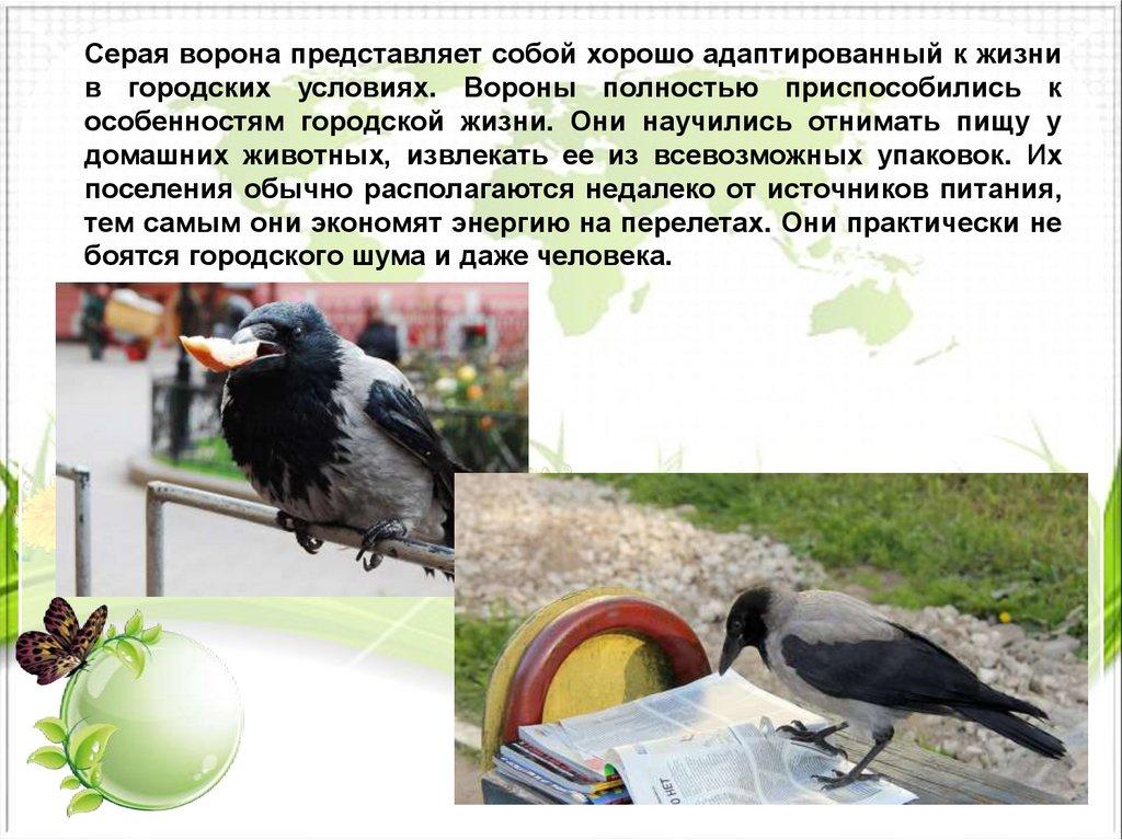 Серая ворона представляет собой хорошо адаптированный к жизнив городских условиях. Вороны полностью приспособились к