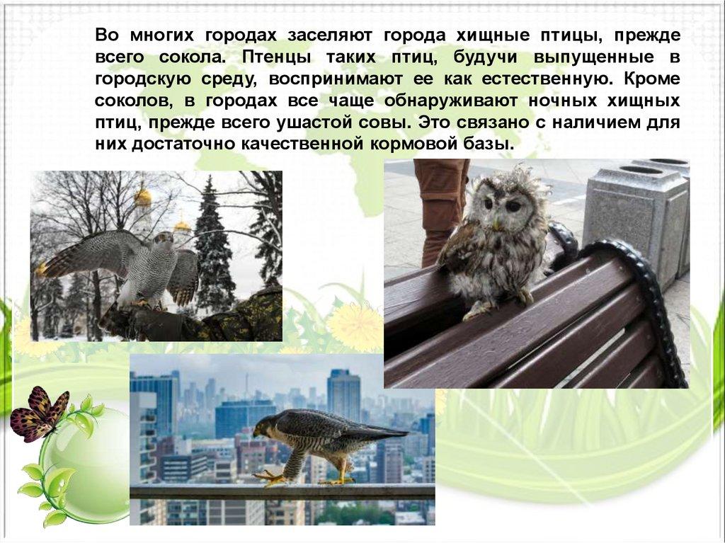 Во многих городах заселяют города хищные птицы, преждевсего сокола. Птенцы таких птиц, будучи выпущенные в