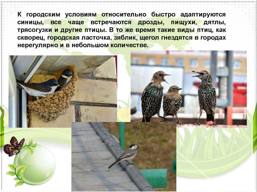 скворец, городская ласточка, зяблик, щегол гнездятся в городах
