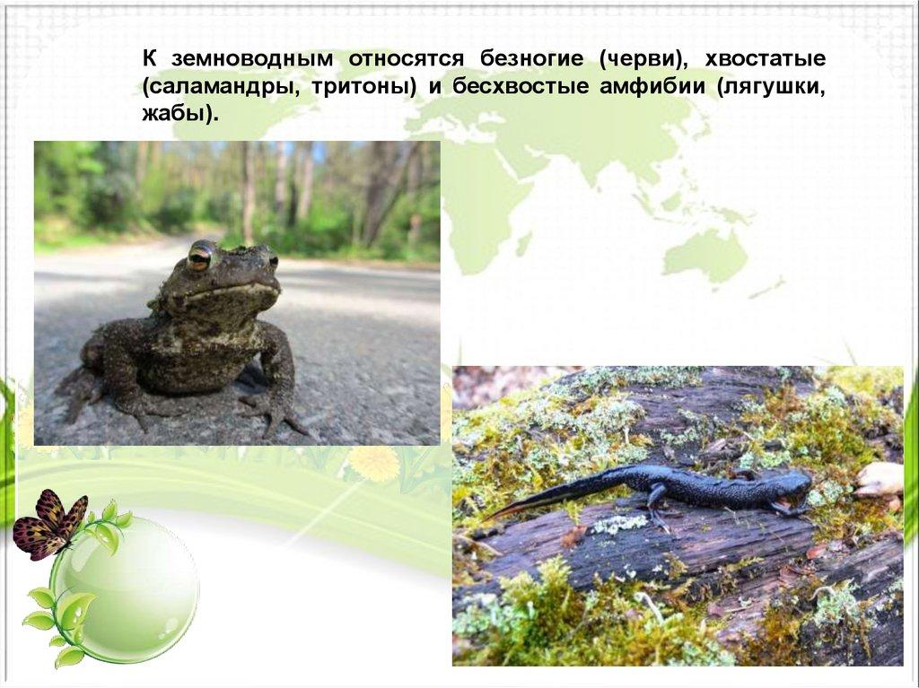 К земноводным относятся безногие (черви), хвостатые(саламандры, тритоны) и бесхвостые амфибии (лягушки,