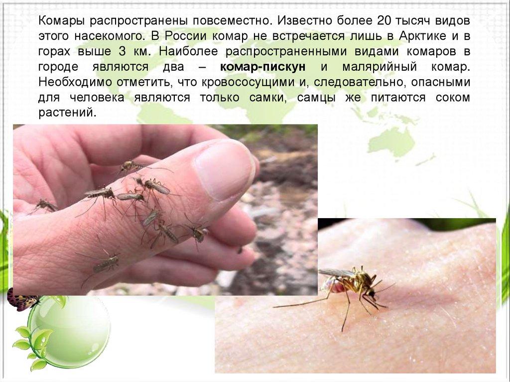 Комары распространены повсеместно. Известно более 20 тысяч видовэтого насекомого. В России комар не встречается лишь в Арктике и в