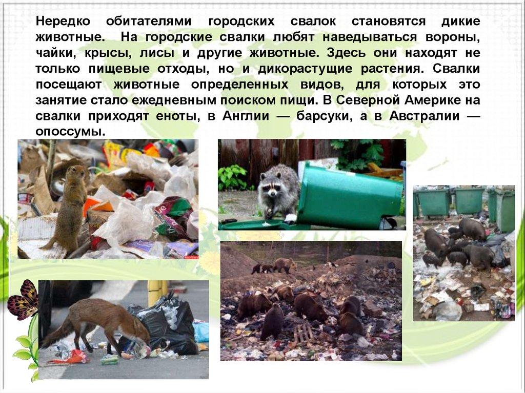 Нередко обитателями городских свалок становятся дикиеживотные. На городские свалки любят наведываться вороны,