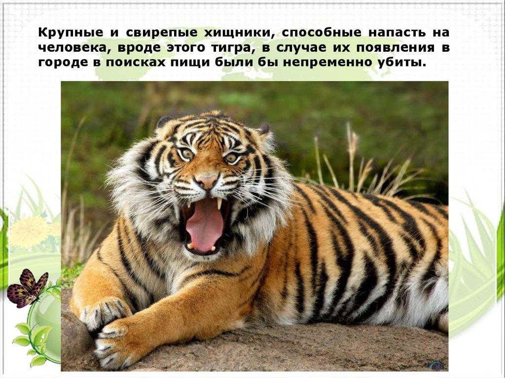 Крупные и свирепые хищники, способные напасть начеловека, вроде этого тигра, в случае их появления в