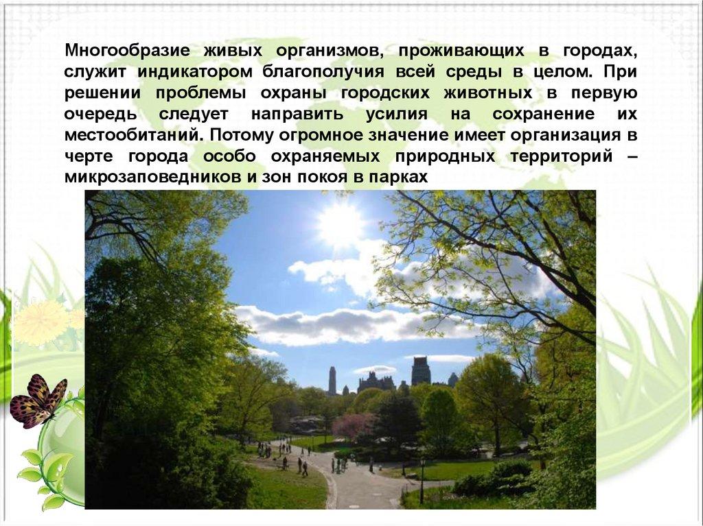 Многообразие живых организмов, проживающих в городах,служит индикатором благополучия всей среды в целом. При
