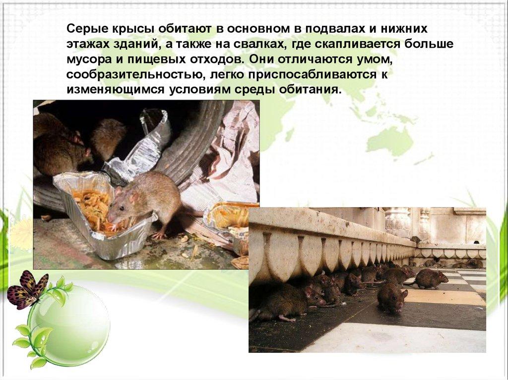 Серые крысы обитают в основном в подвалах и нижнихэтажах зданий, а также на свалках, где скапливается больше