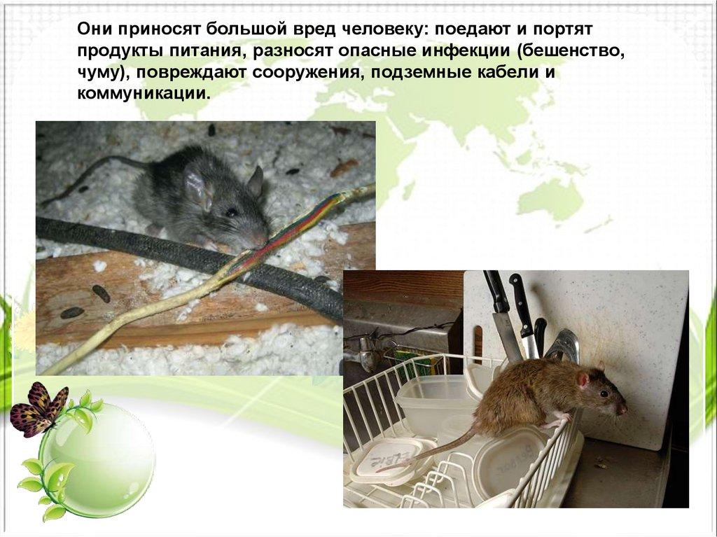 Они приносят большой вред человеку: поедают и портятпродукты питания, разносят опасные инфекции (бешенство,