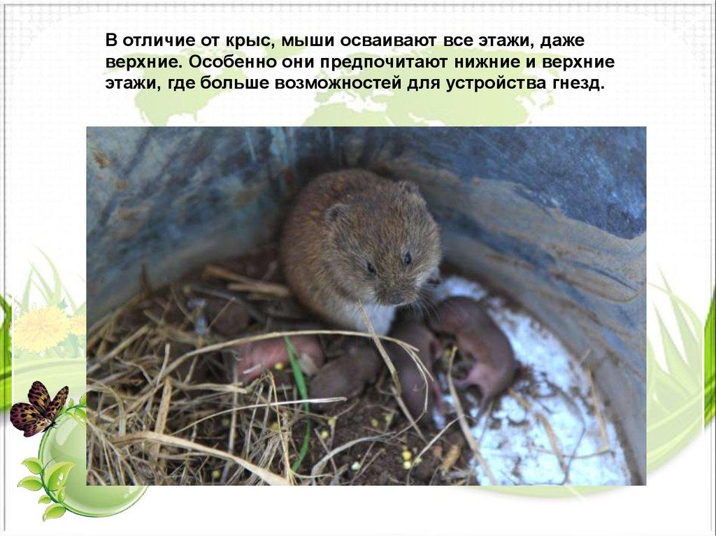 В отличие от крыс, мыши осваивают все этажи, дажеверхние. Особенно они предпочитают нижние и верхние