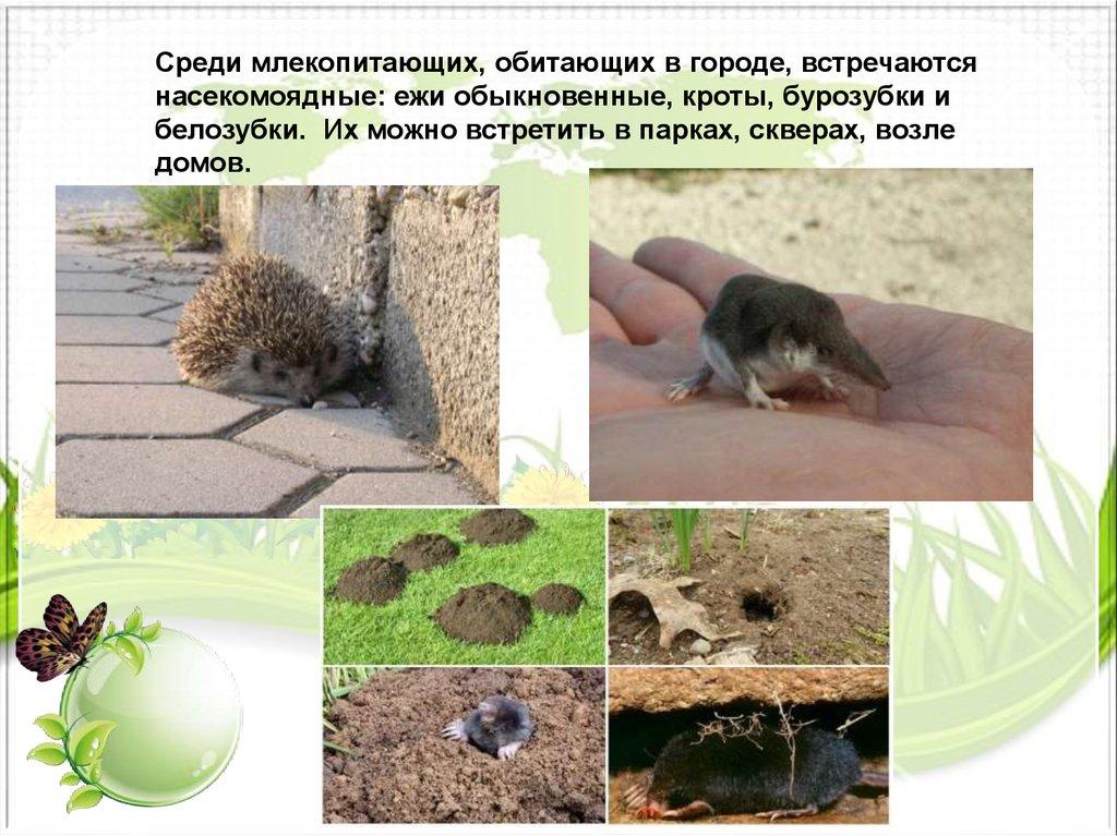 Среди млекопитающих, обитающих в городе, встречаютсянасекомоядные: ежи обыкновенные, кроты, бурозубки и