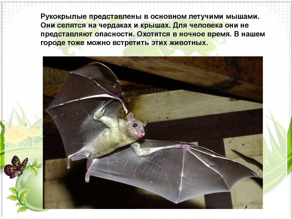 Рукокрылые представлены в основном летучими мышами.Они селятся на чердаках и крышах. Для человека они не