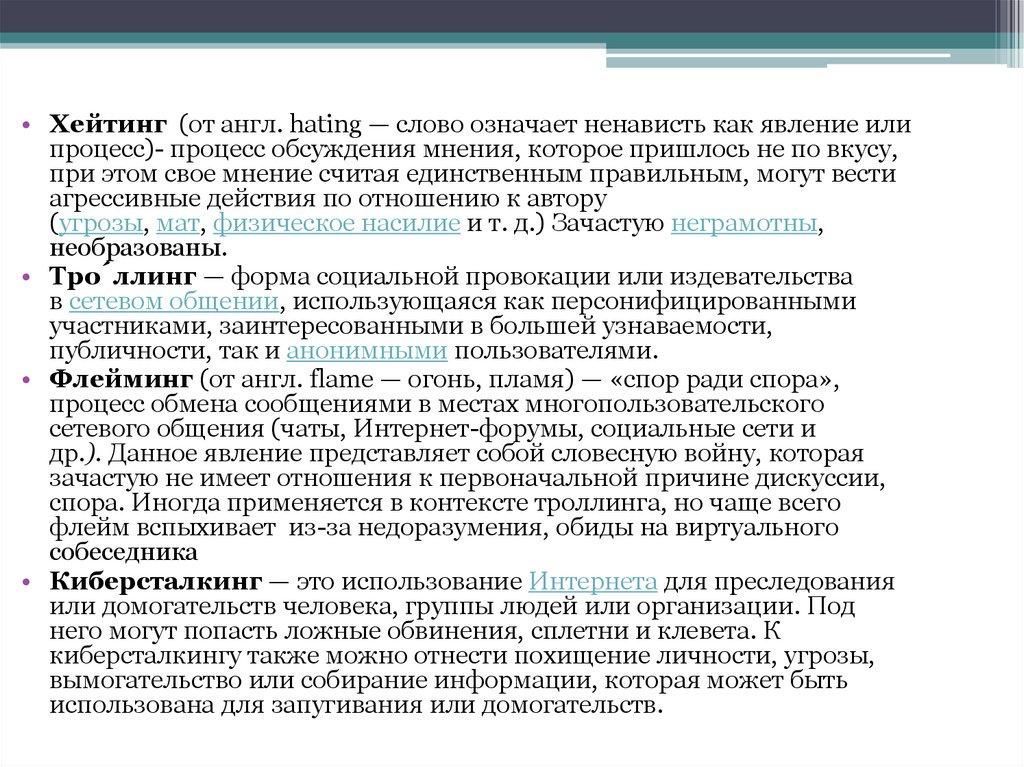• Хейтинг (от англ. hating — слово означает ненависть как явление илипроцесс)- процесс обсуждения мнения, которое пришлось не по вкусу,