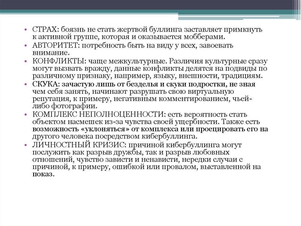 • СТРАХ: боязнь не стать жертвой буллинга заставляет примкнутьк активной группе, которая и оказывается мобберами.