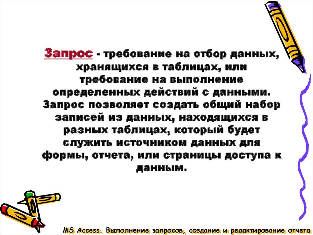 Запрос - требование на отбор данных,хранящихся в таблицах, или