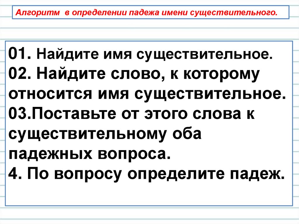 Алгоритм в определении падежа имени существительного.01. Найдите имя существительное.