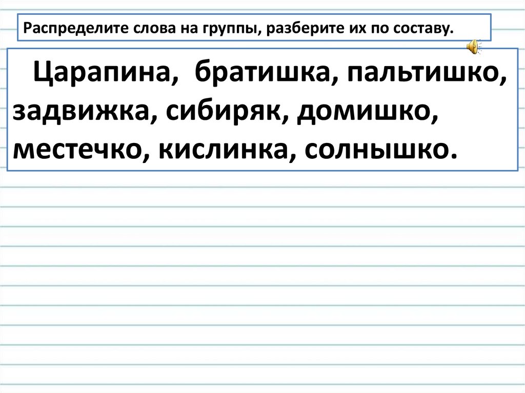 Распределите слова на группы, разберите их по составу.Царапина, братишка, пальтишко,