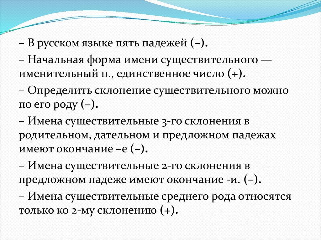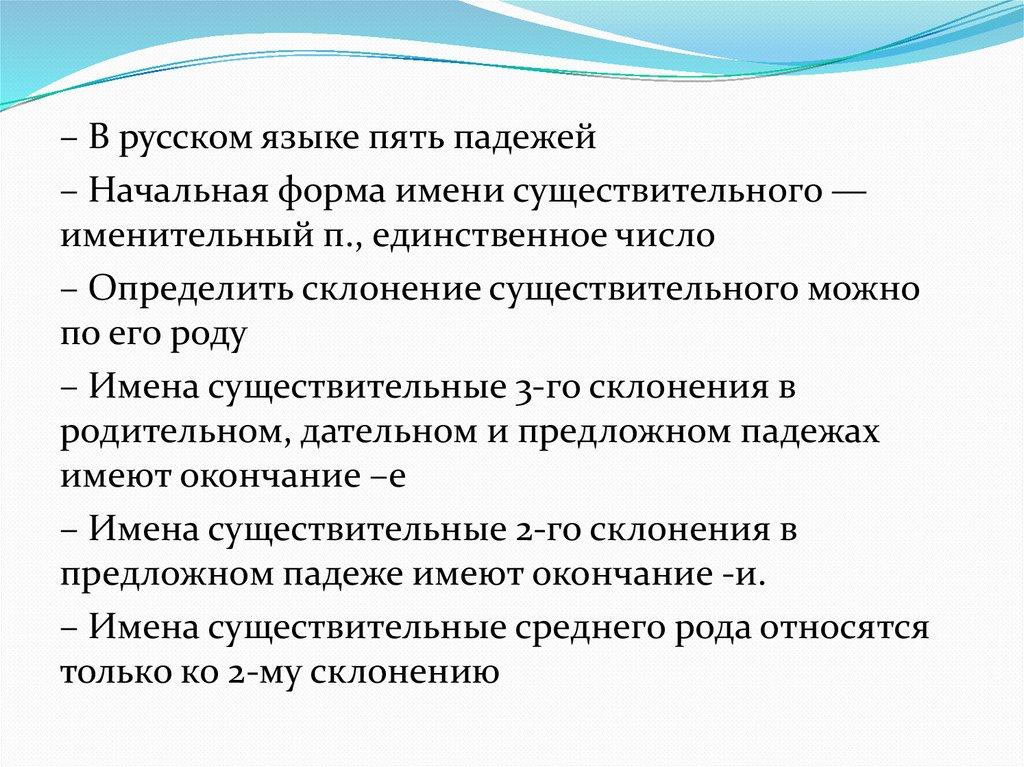 – В русском языке пять падежей (–).– Начальная форма имени существительного —