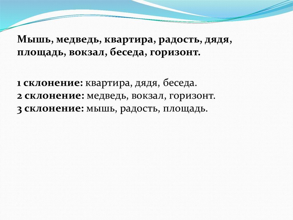 Мышь, медведь, квартира, радость, дядя,площадь, вокзал, беседа, горизонт.