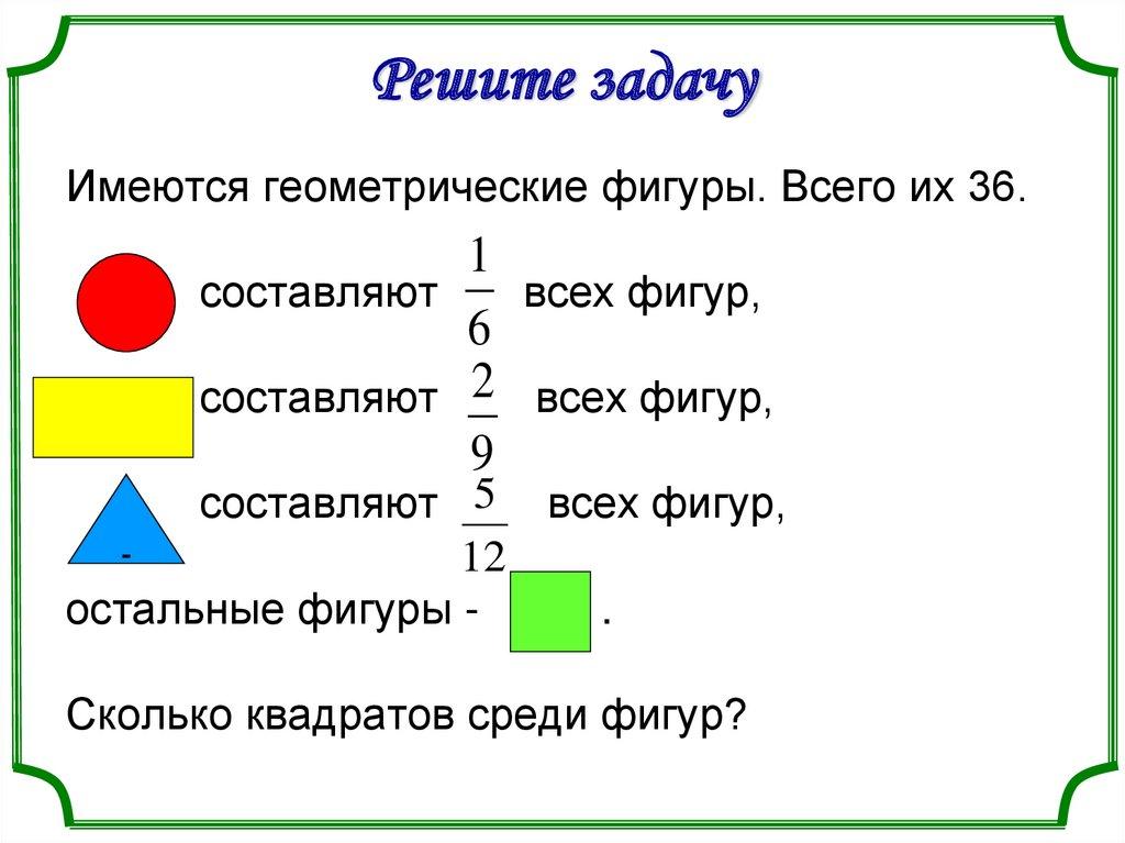 Решите задачуИмеются геометрические фигуры. Всего их 36.