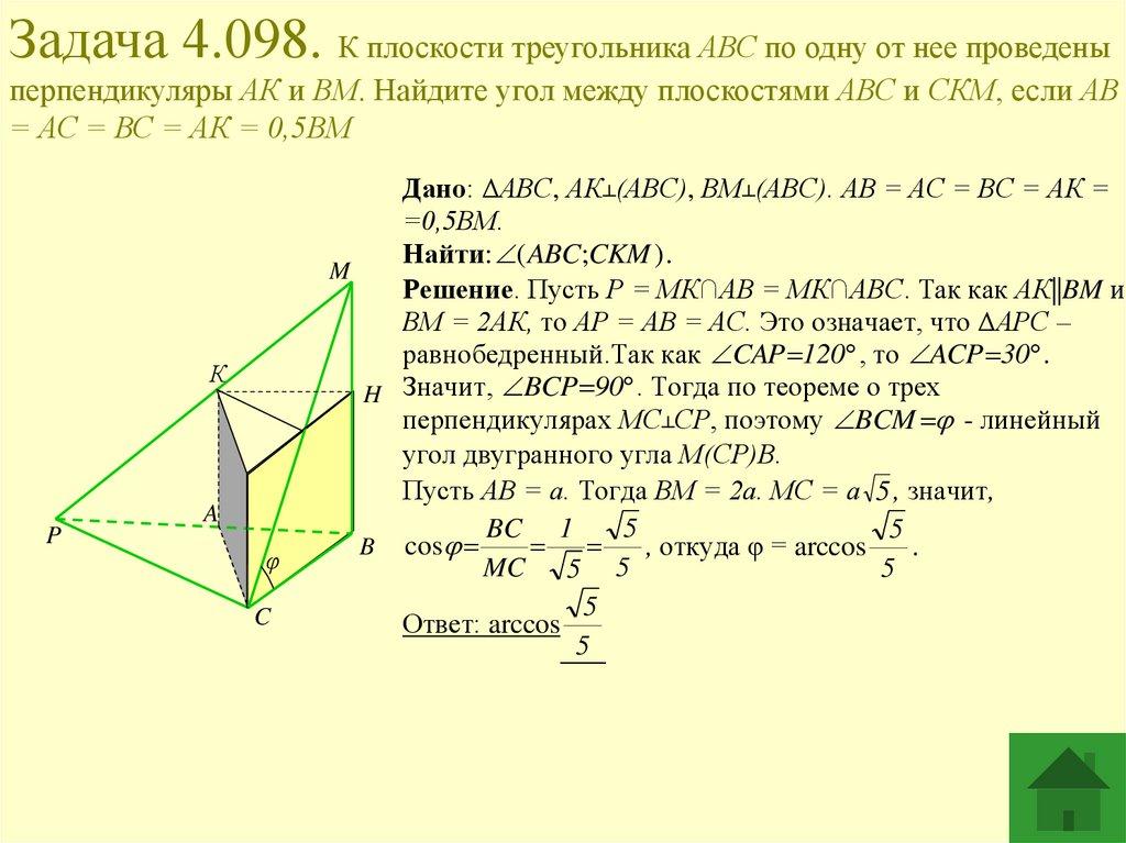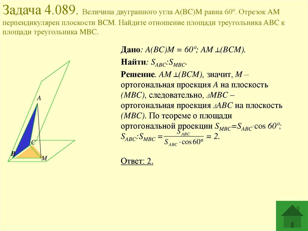 Задача 4.089. Величина двугранного угла A(BC)M равна 60º. Отрезок AMперпендикулярен плоскости BCM. Найдите отношение площади треугольника ABC к