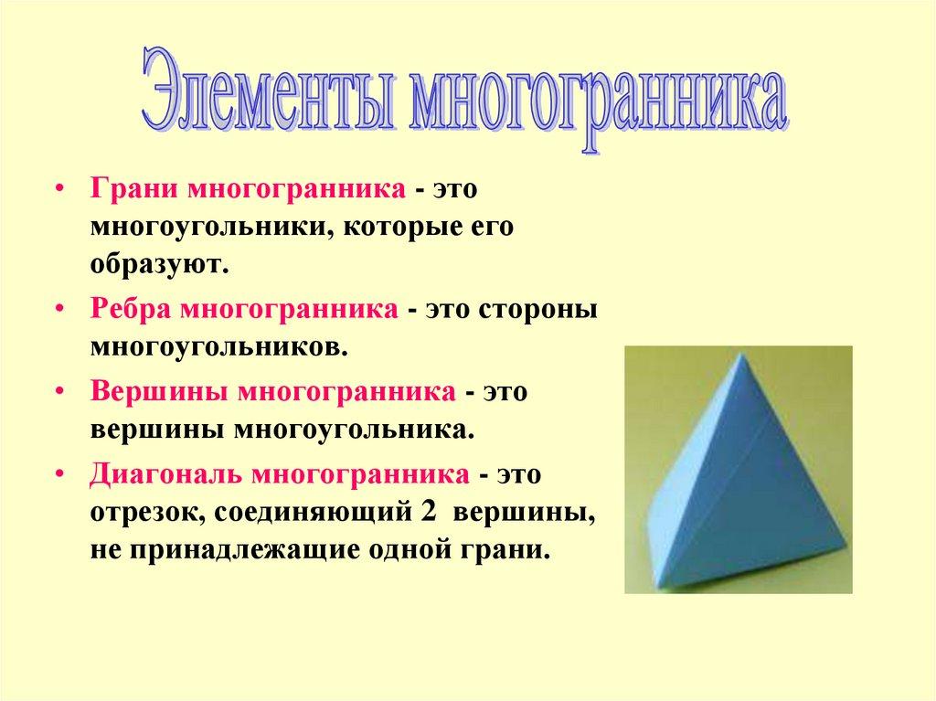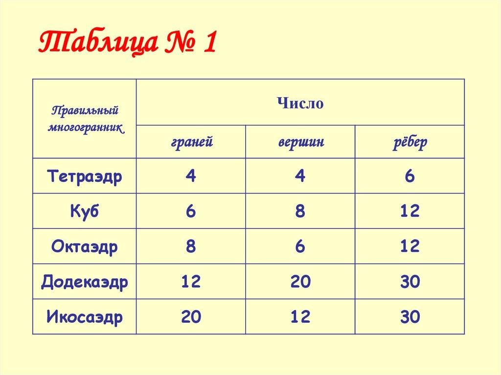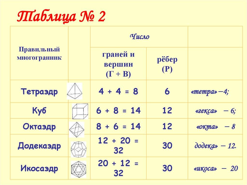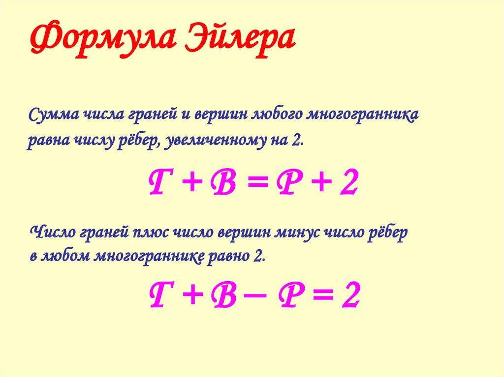 Формула ЭйлераСумма числа граней и вершин любого многогранника