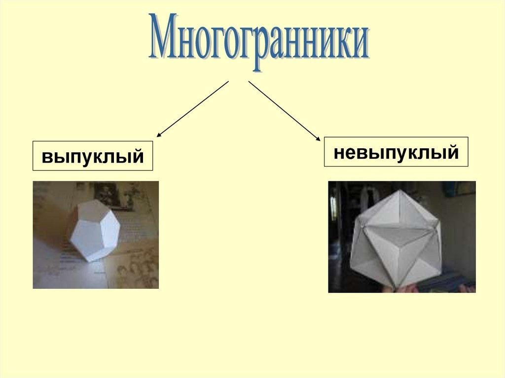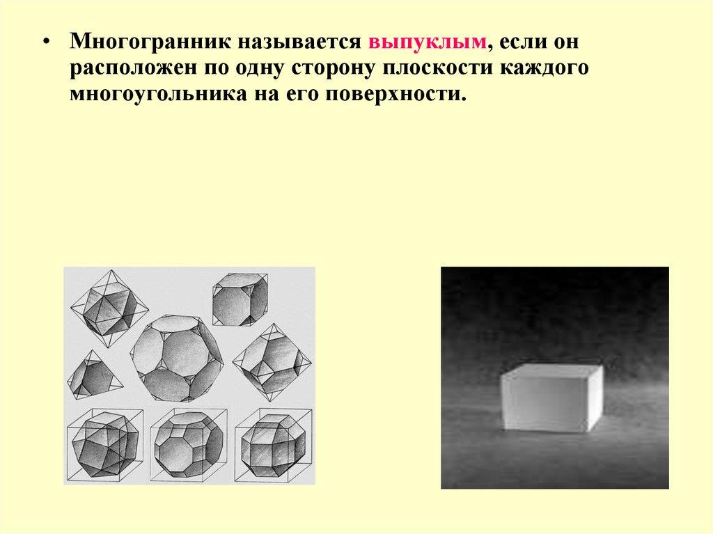 • Многогранник называется выпуклым, если онрасположен по одну сторону плоскости каждого