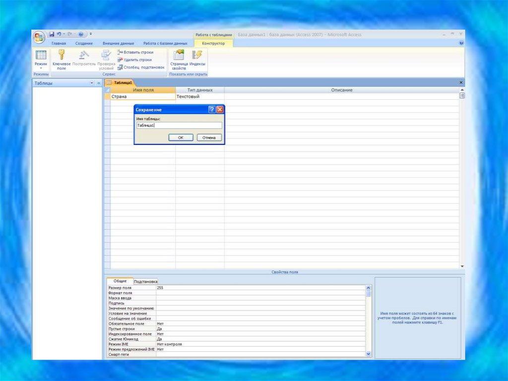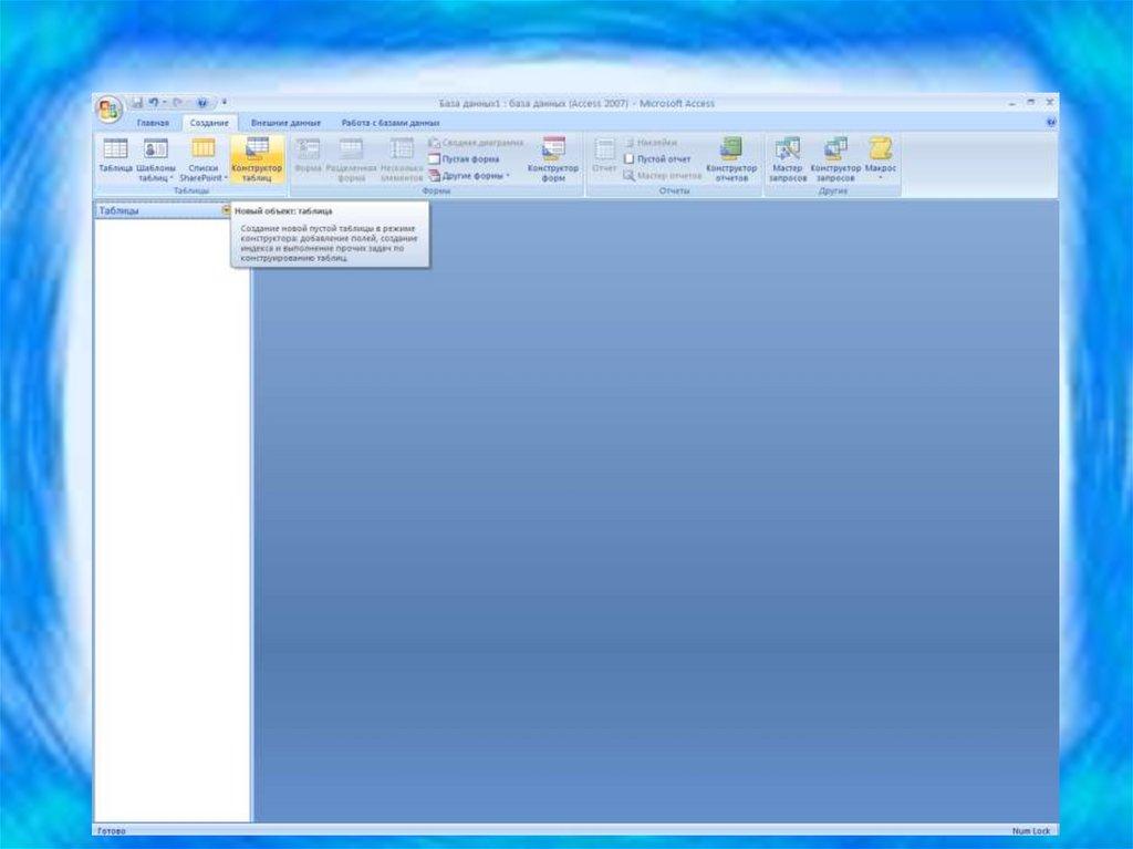 • Таблицы – основные объекты базы данных (БД). В них хранятсяданные. Реляционная база данных может иметь много