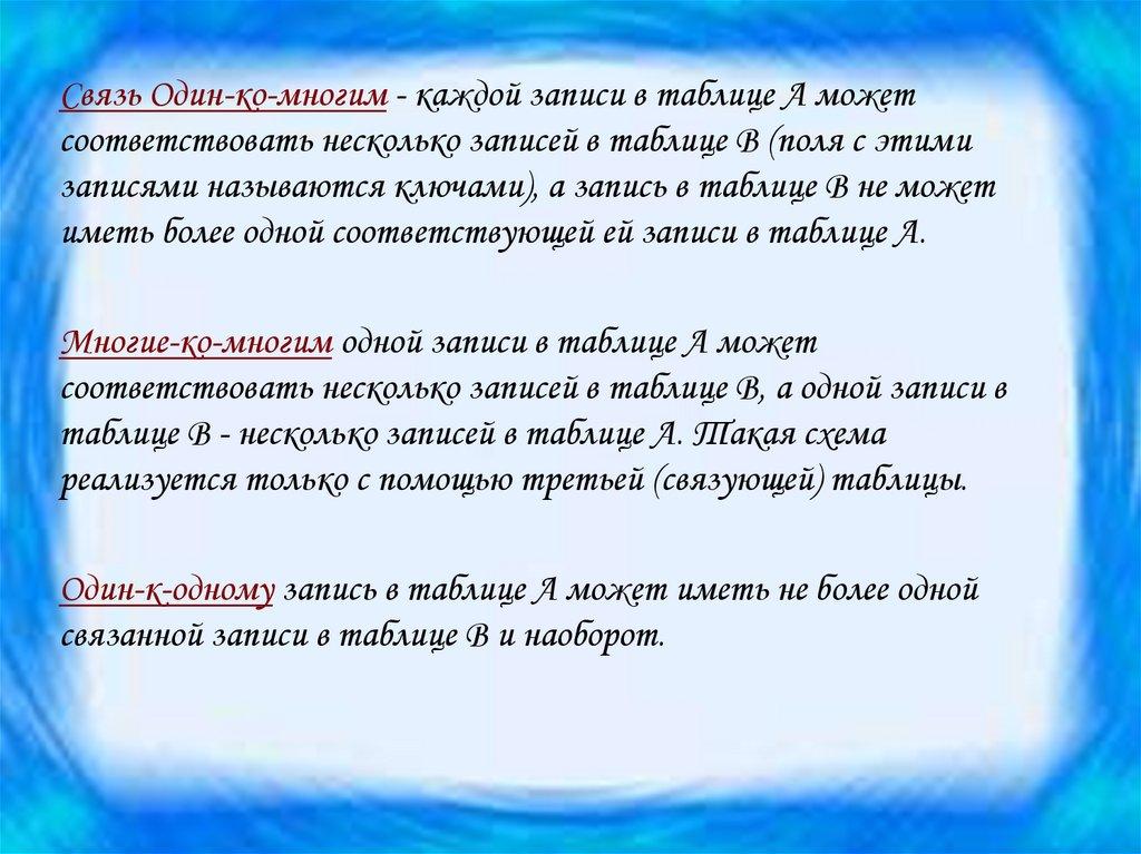 Связь Один-ко-многим - каждой записи в таблице А можетсоответствовать несколько записей в таблице В (поля с этими