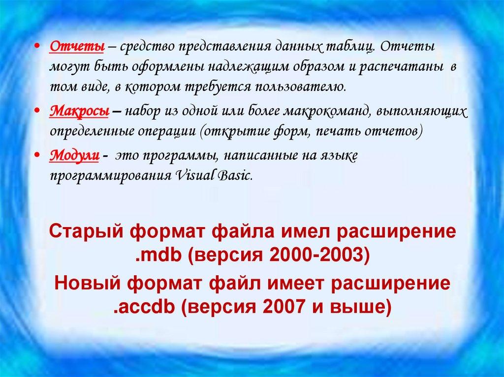 • Отчеты – средство представления данных таблиц. Отчетымогут быть оформлены надлежащим образом и распечатаны в