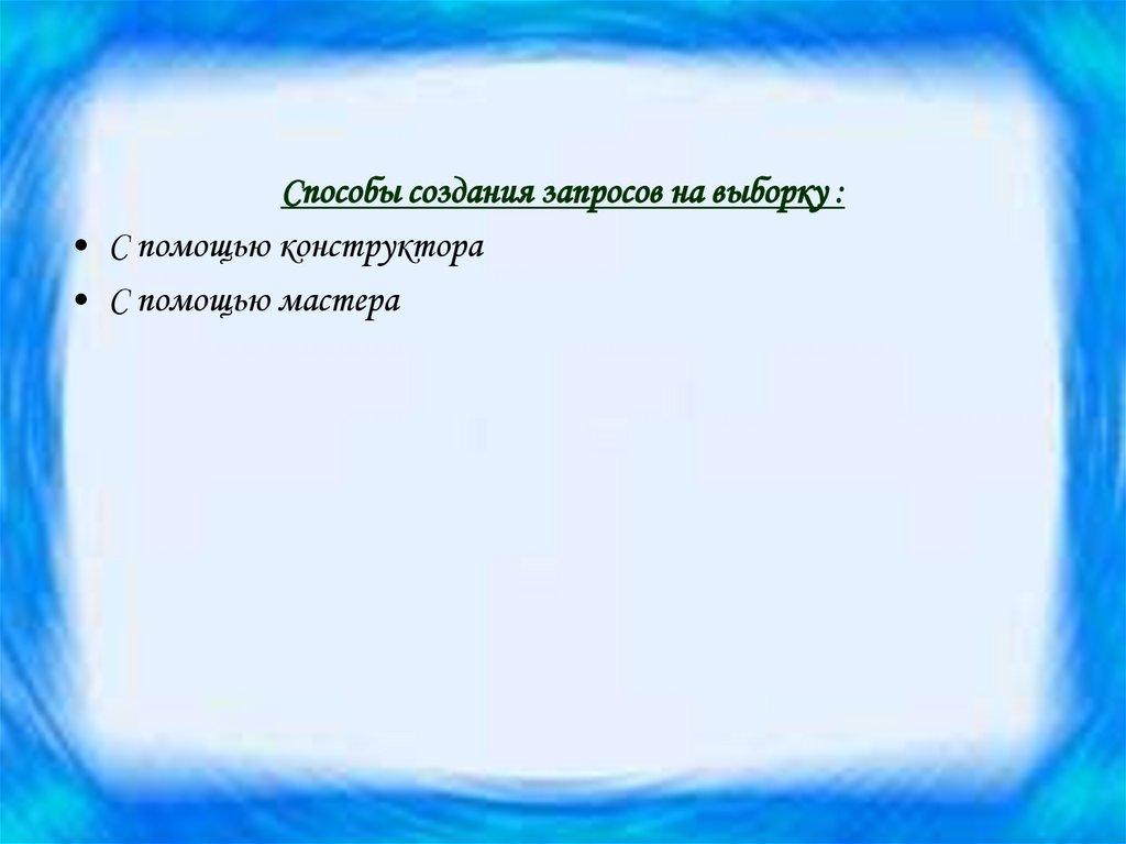 Способы создания запросов на выборку :• С помощью конструктора