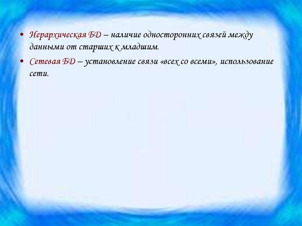 • Иерархическая БД – наличие односторонних связей междуданными от старших к младшим.