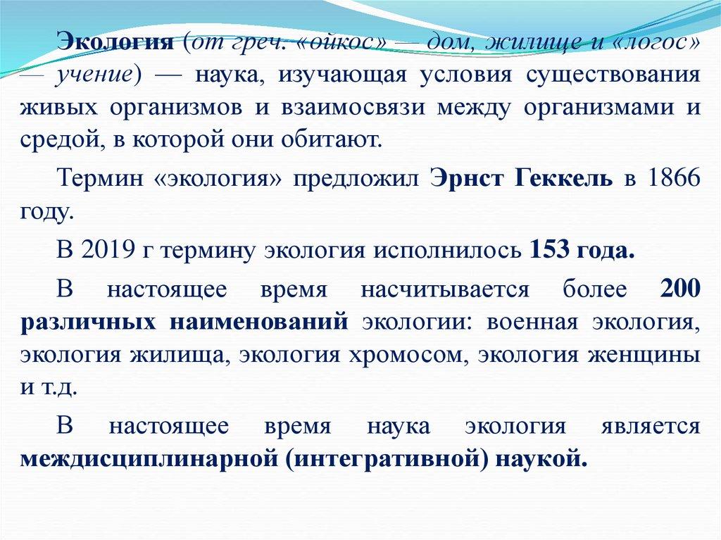 Экология (от греч. «ойкос» — дом, жилище и «логос»— учение) — наука, изучающая условия существования