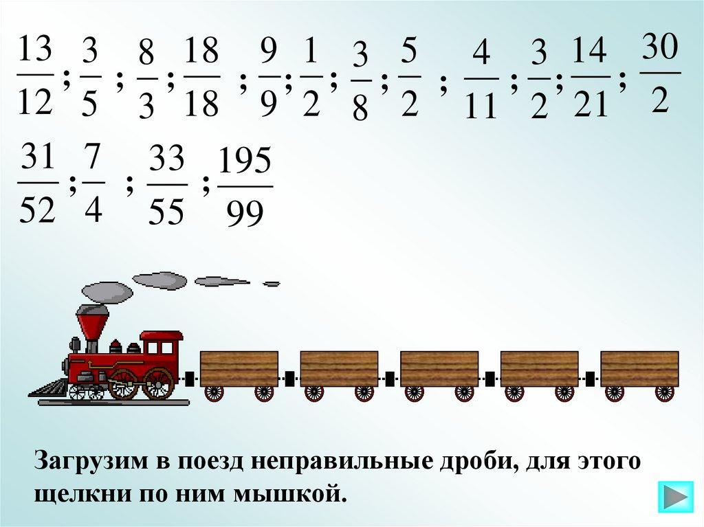 Загрузим в поезд неправильные дроби, для этого