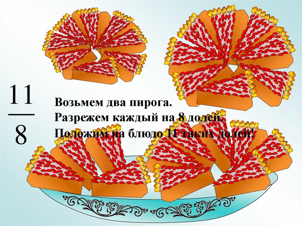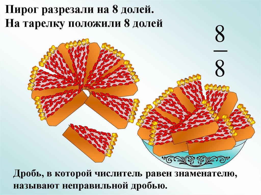 Пирог разрезали на 8 долей.На тарелку положили 8 долей