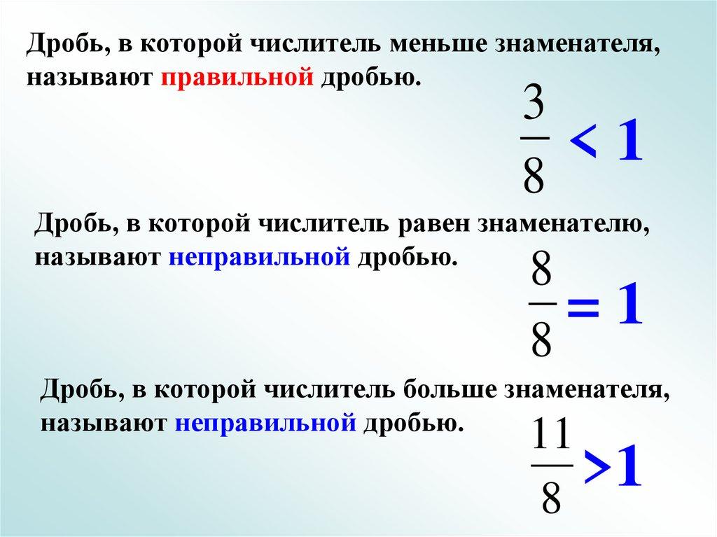 2) Если числитель меньше знаменателя, то дробьа) правильная; б) неправильная; в) обыкновенная.