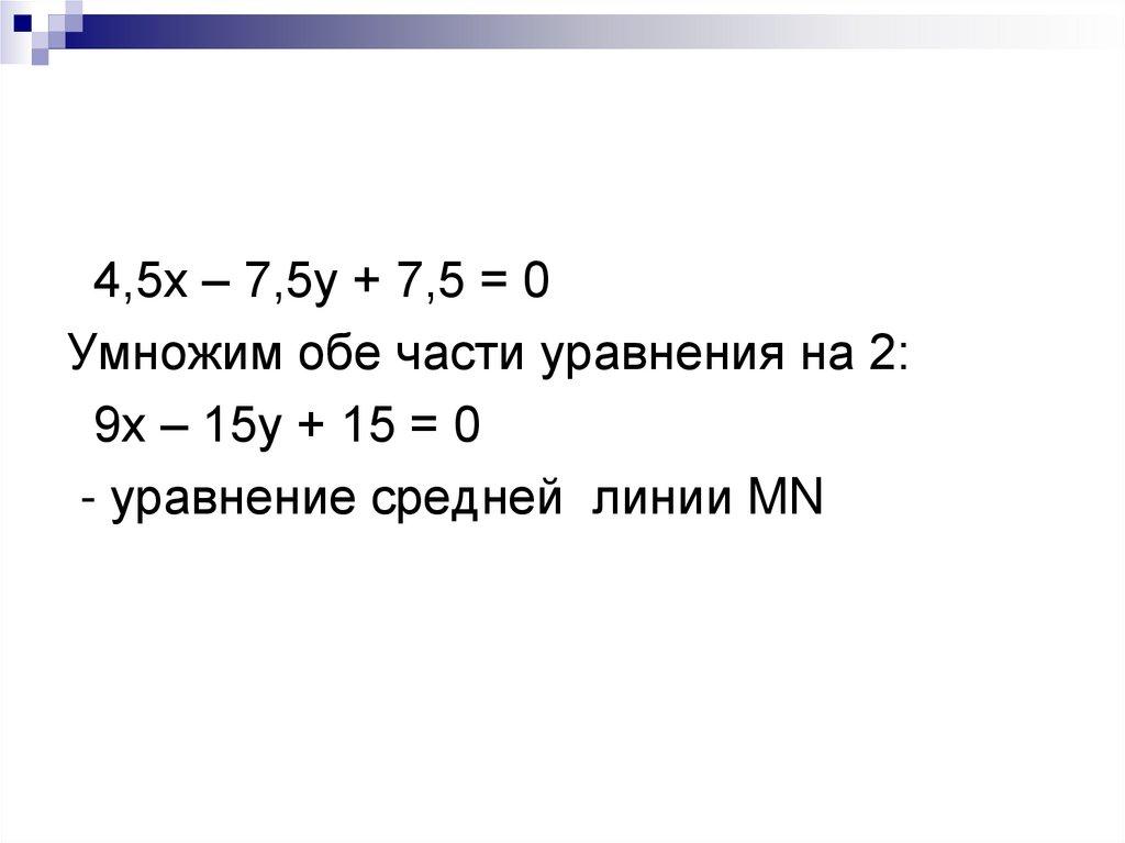 4,5х – 7,5у + 7,5 = 0Умножим обе части уравнения на 2: